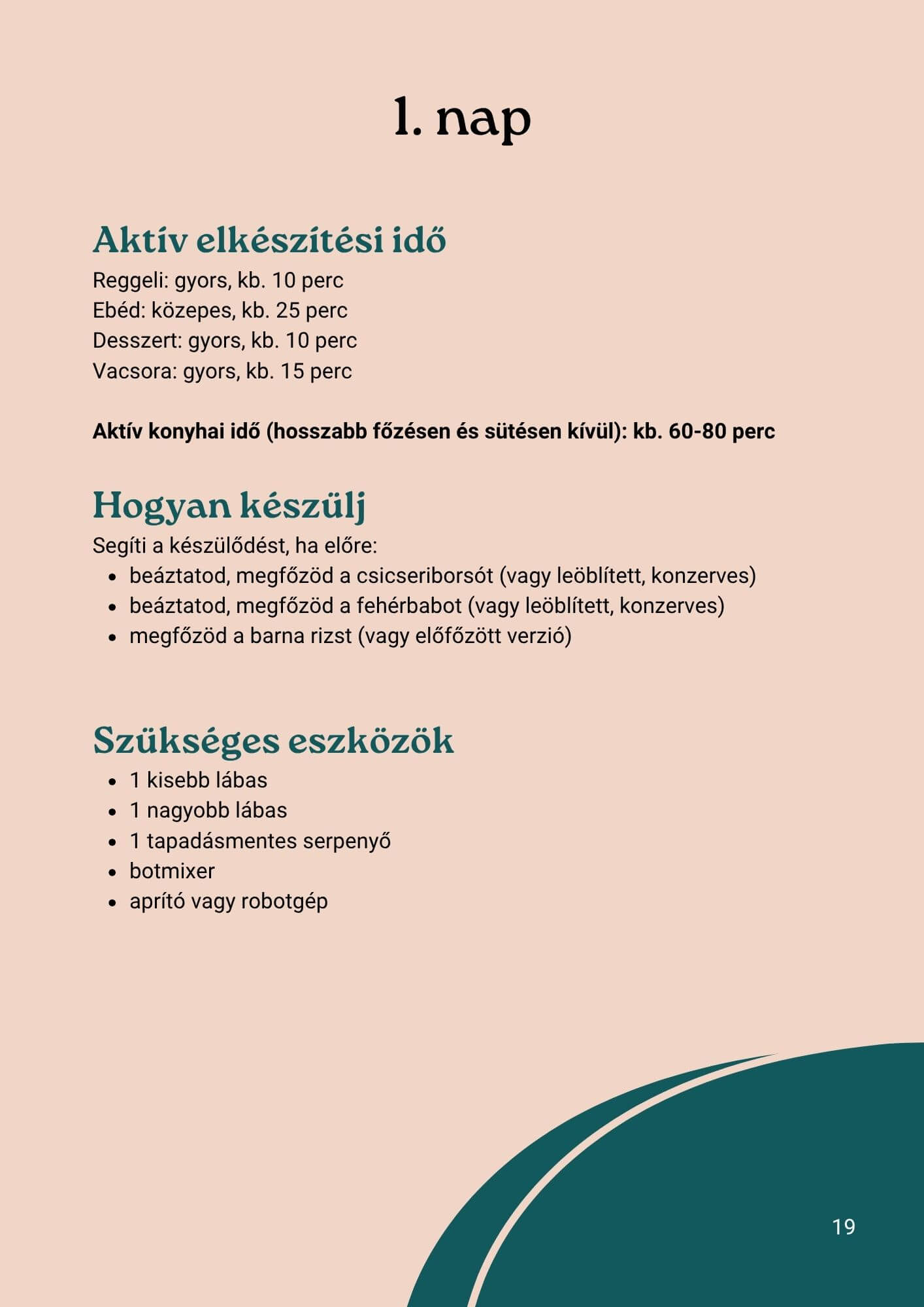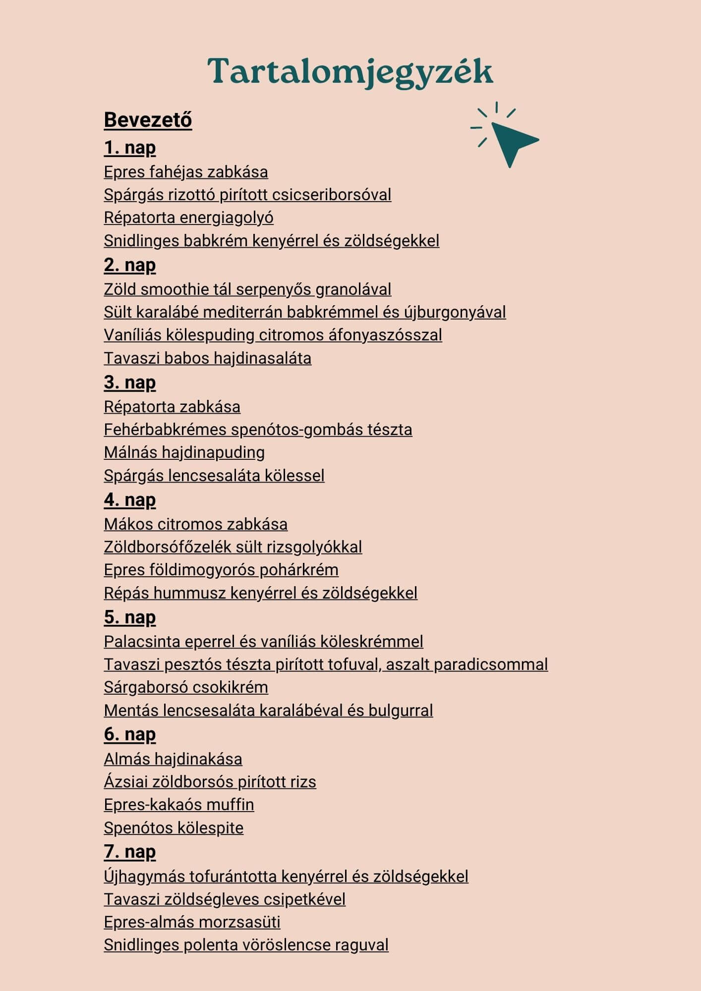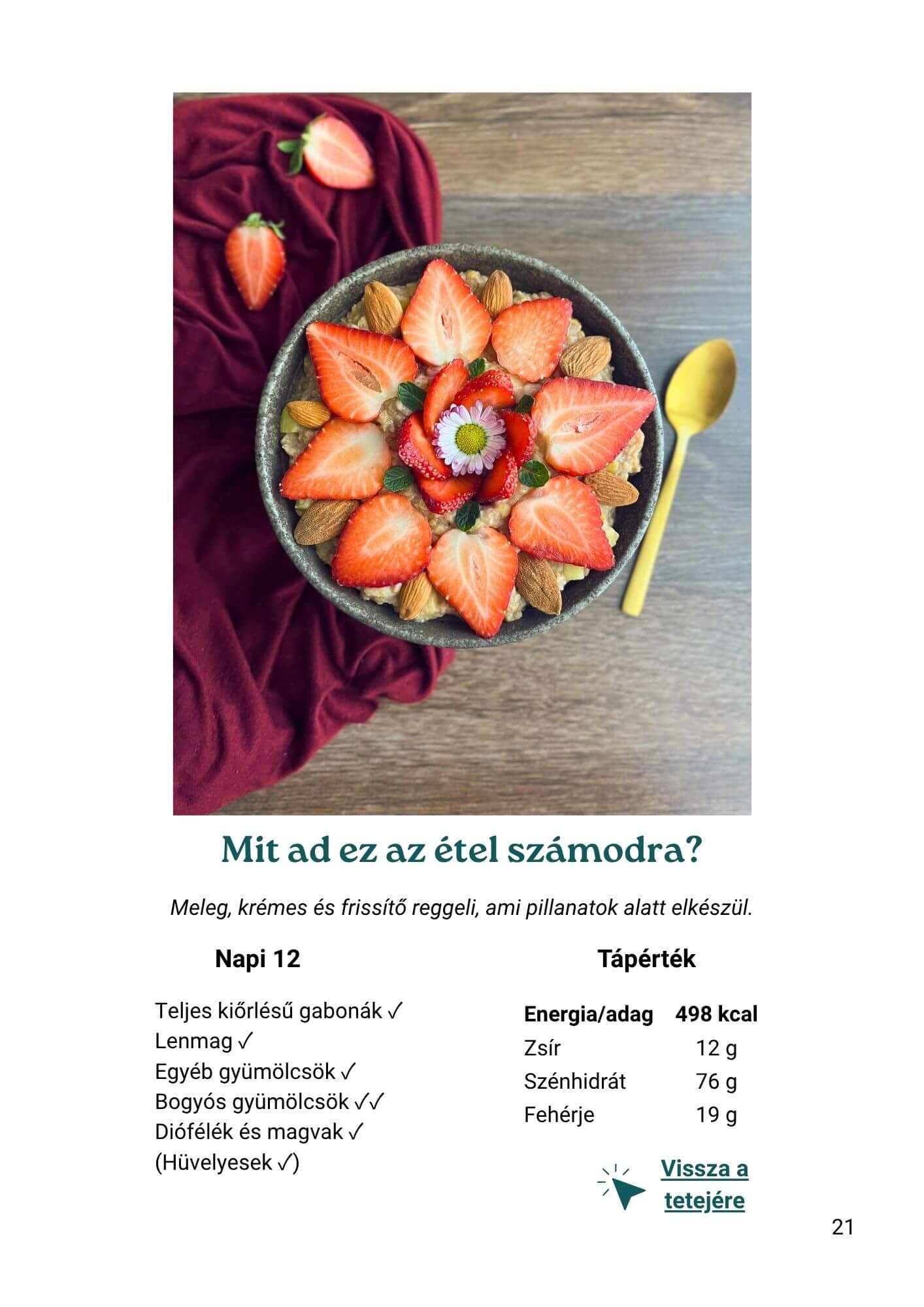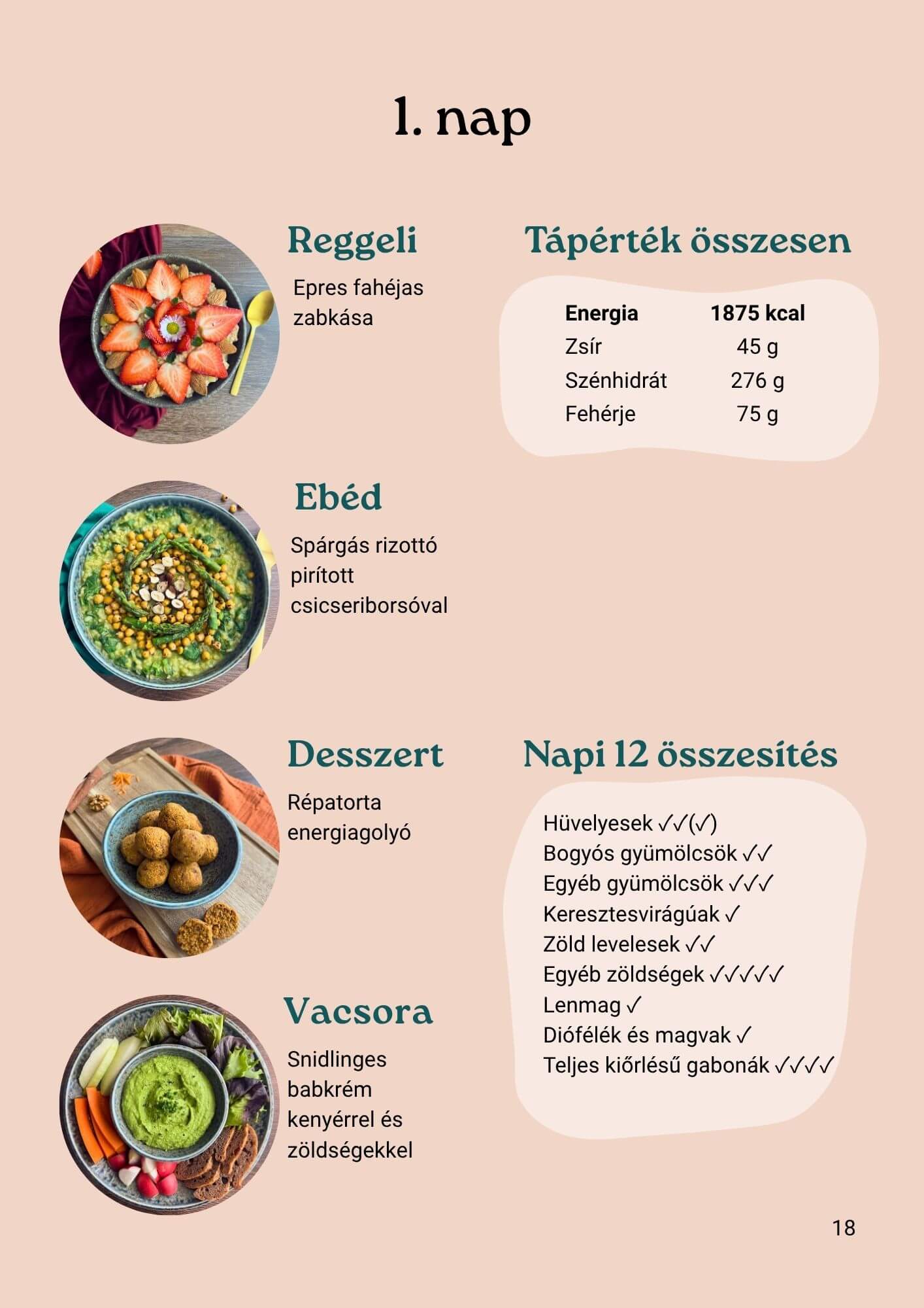 28 recept helyett egy komplett rendszert. Minden recept okostányér szemlélettel van összeállítva (50% zöldség, 25% gabona, 25% hüvelyes), minden napnál napi tucat ellenőrző lista segít eligazodni, és minden receptnél ott vannak a tápérték- és kalóriaadatok is.