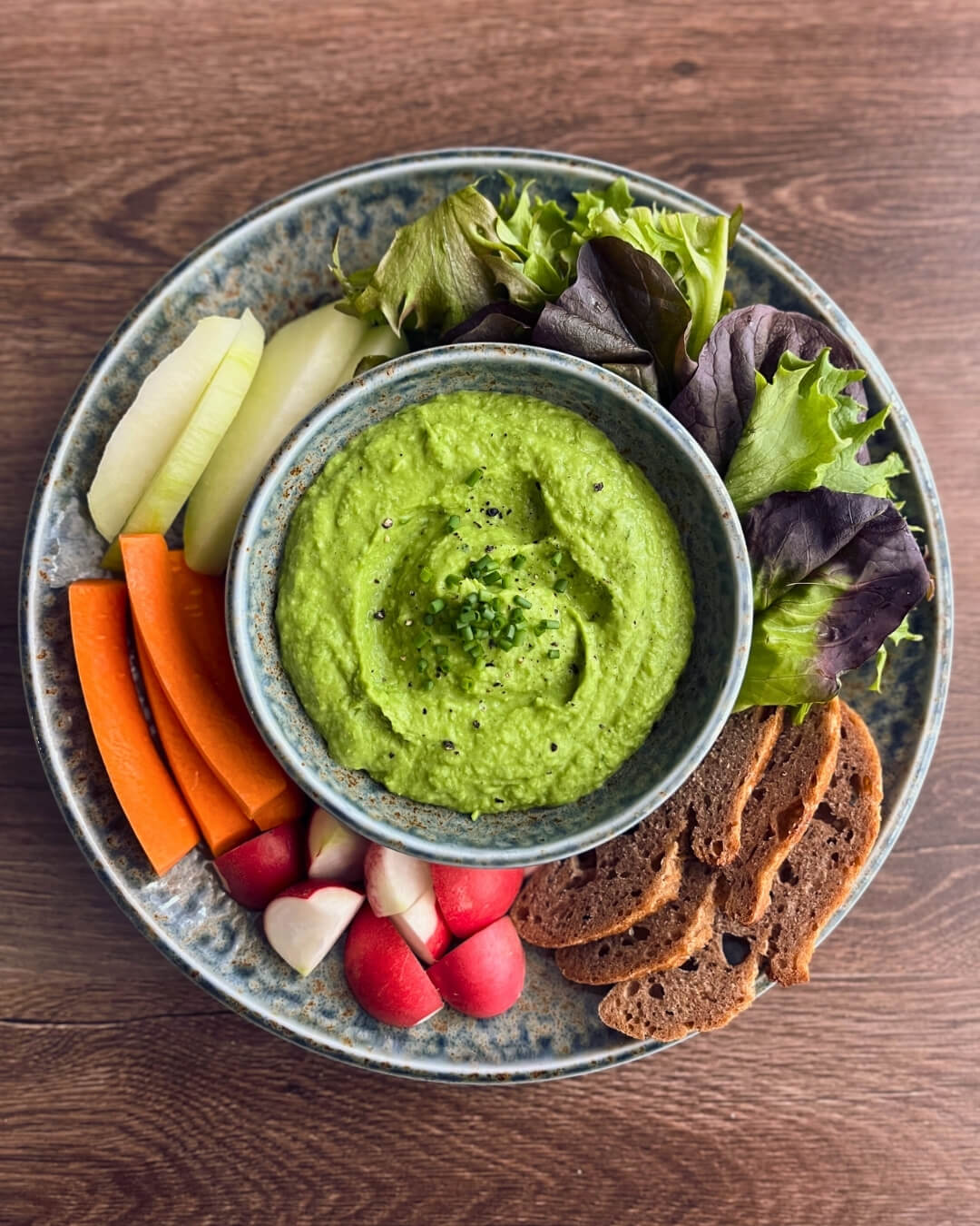 – Snidlinges babhummusz kenyérrel és zöldségekkel